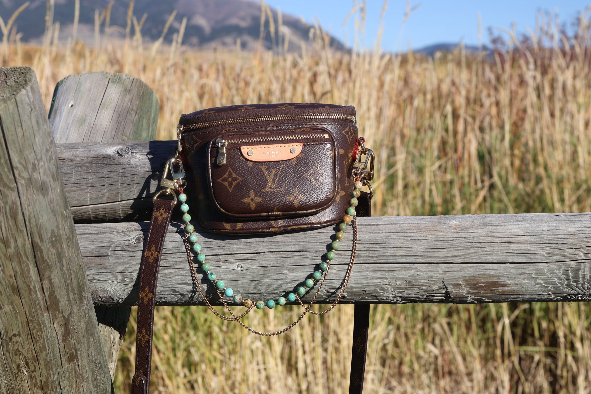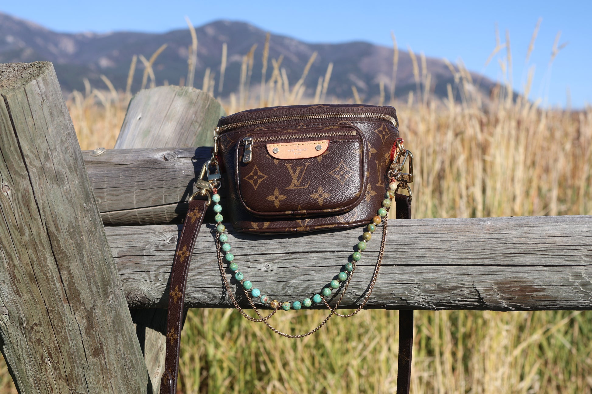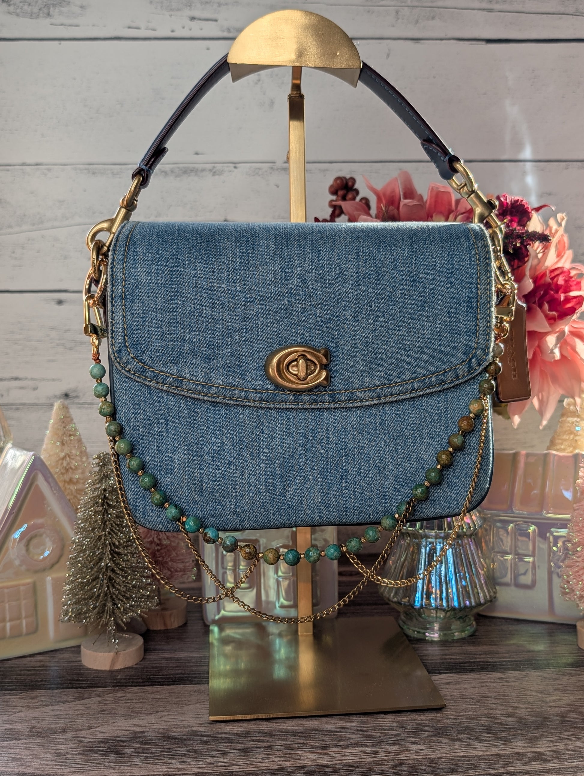 All of my one of a kind beaded bag chains are hand strung on 100% silk cord using luxe grade gold snaps at each end. This piece measures approximately 15.5" long from clip end to clip end.