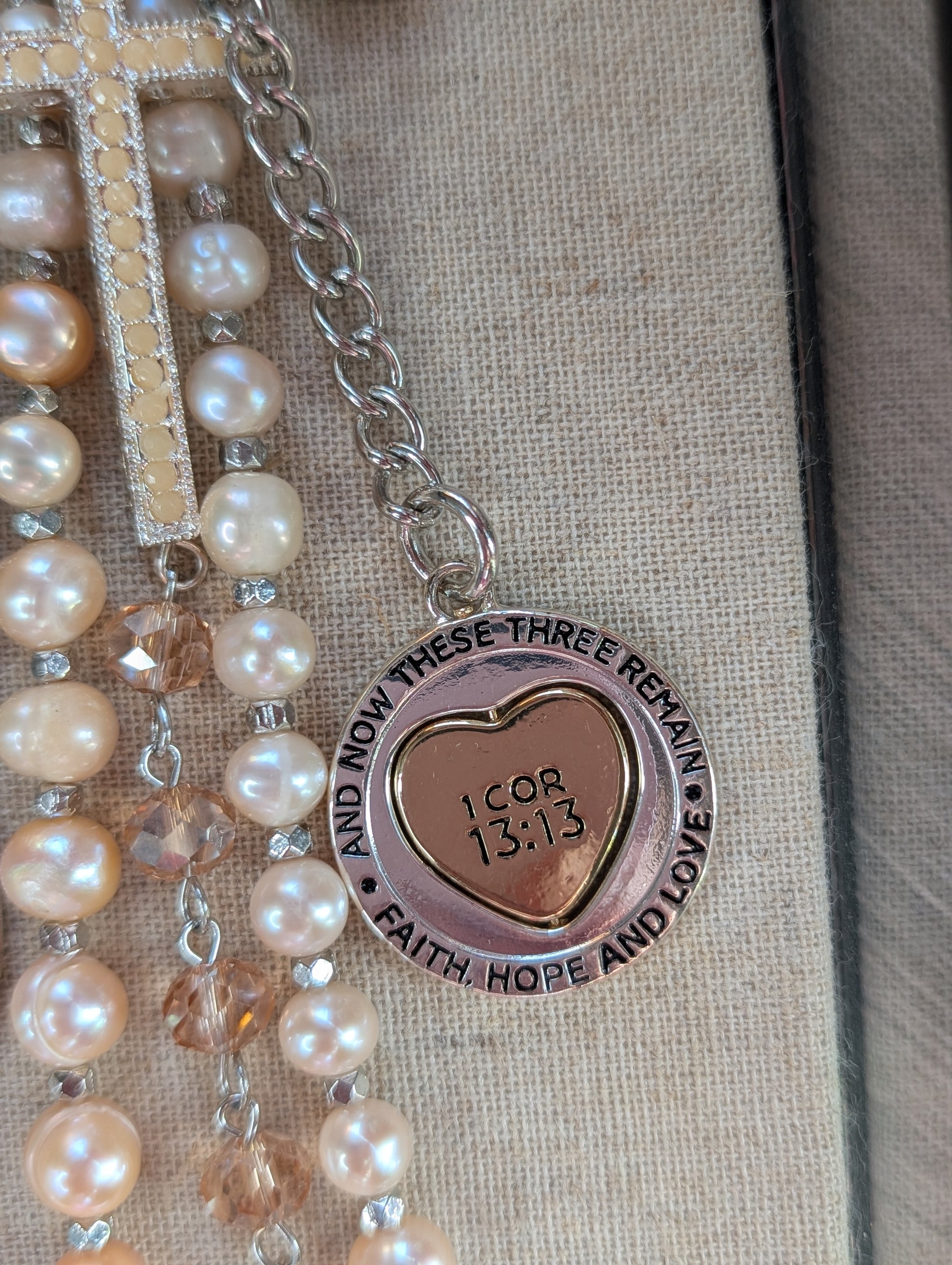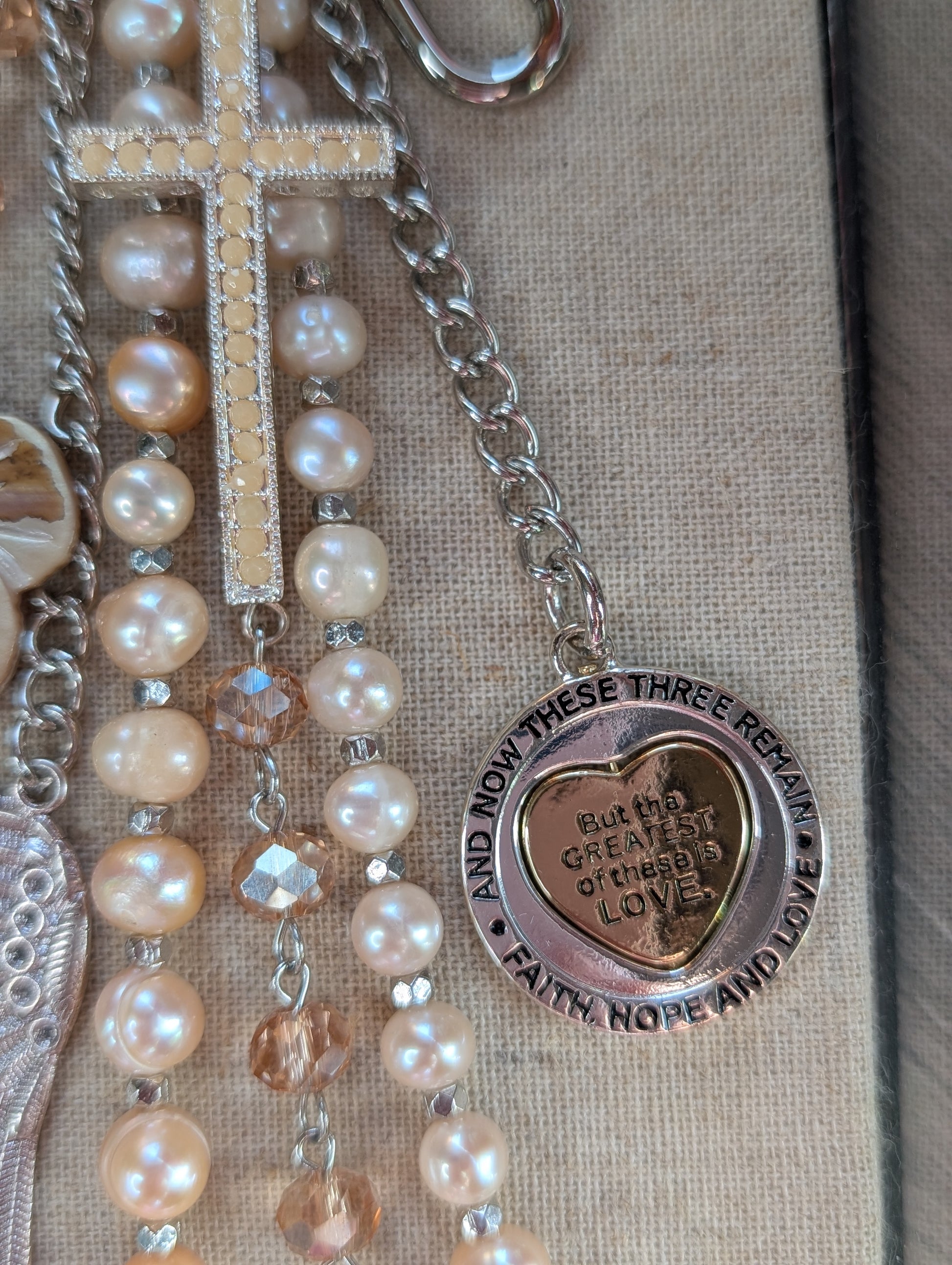 This piece features Mexican Morado Opal, a beautiful Mother of Pearl Sakura flower charm, a small cream Howlite cross, Faith Can Move Mountains, all on a silver luxe snap. It measures 8" from top of clip to the lowest point.