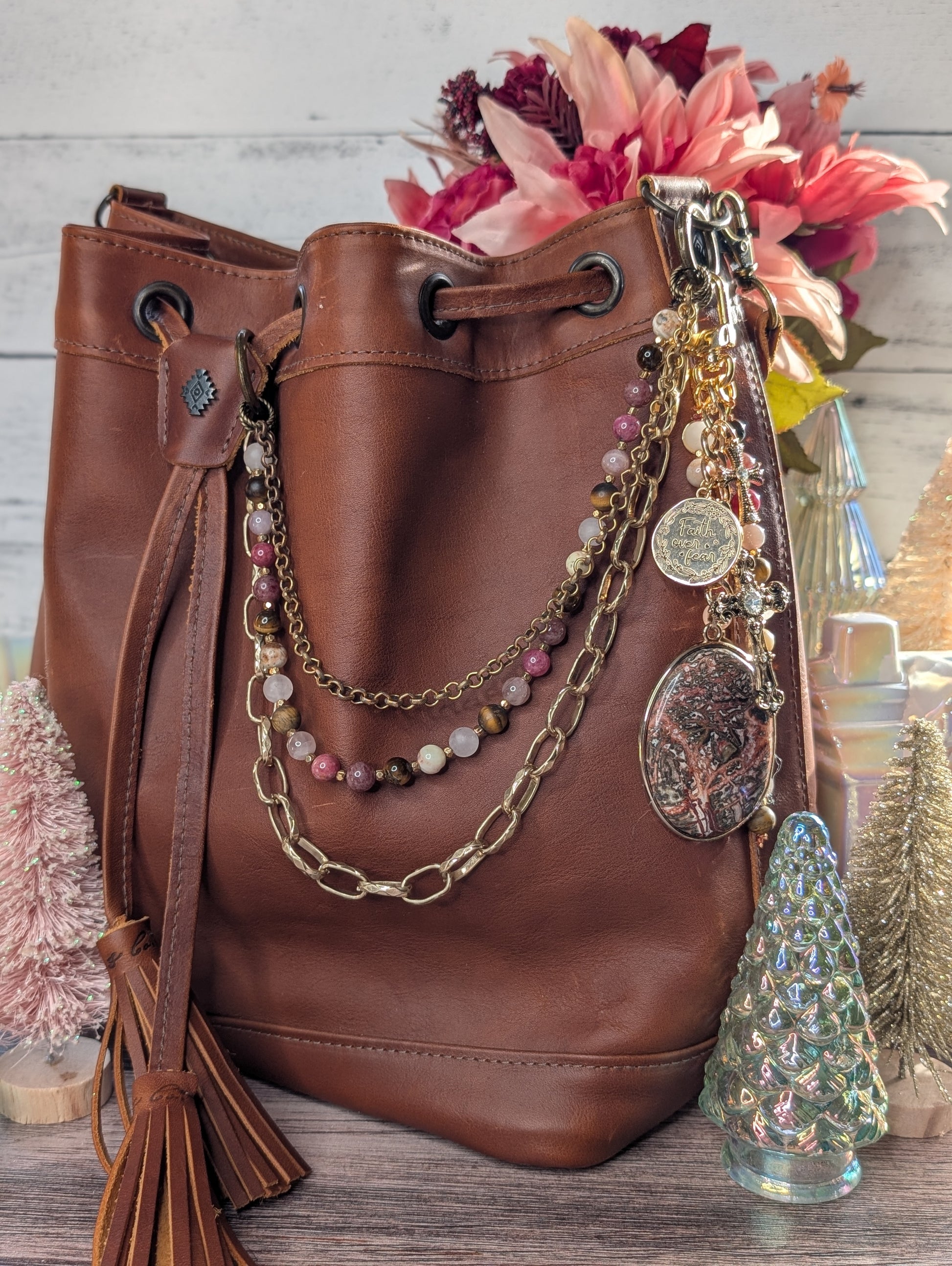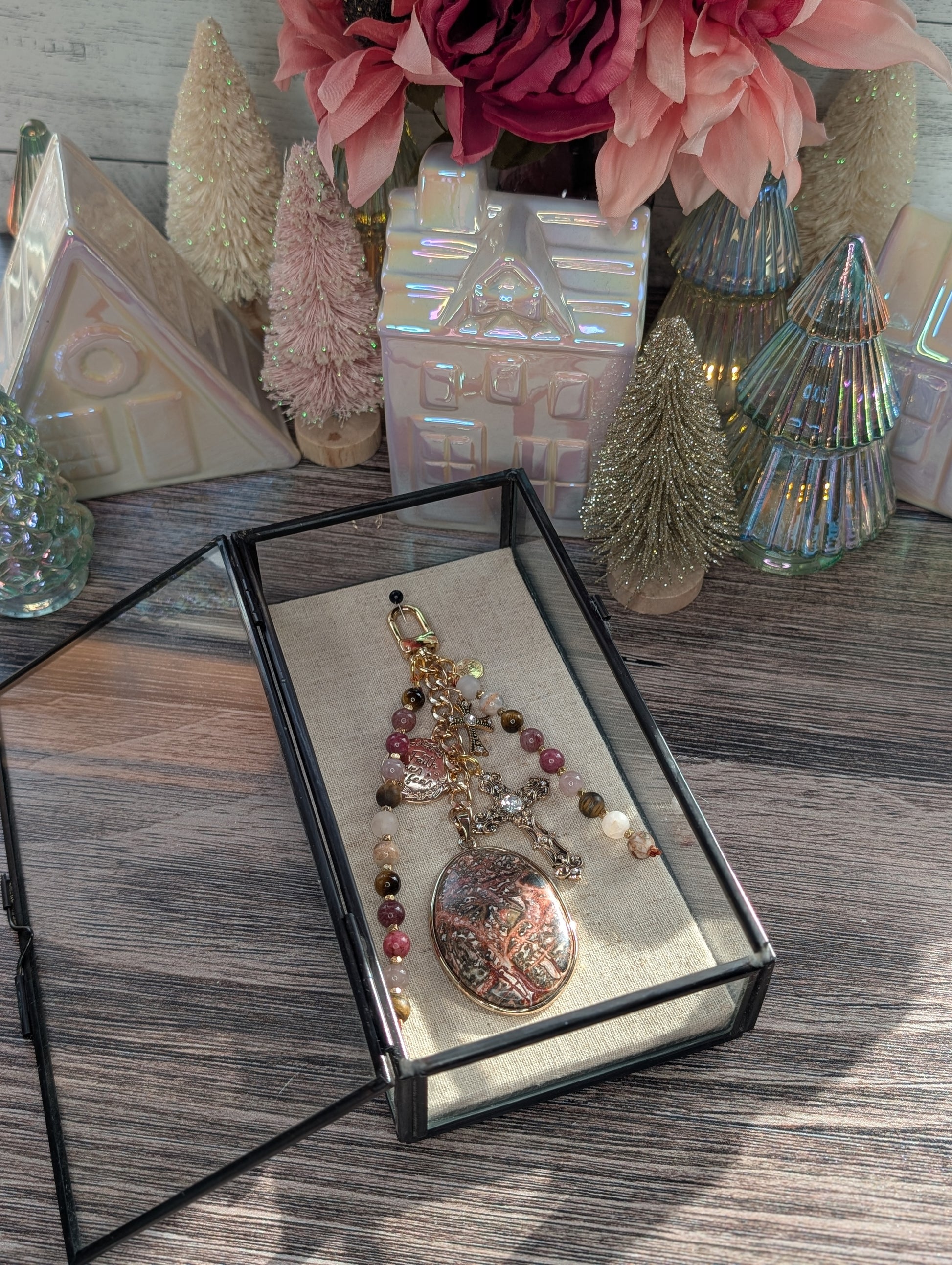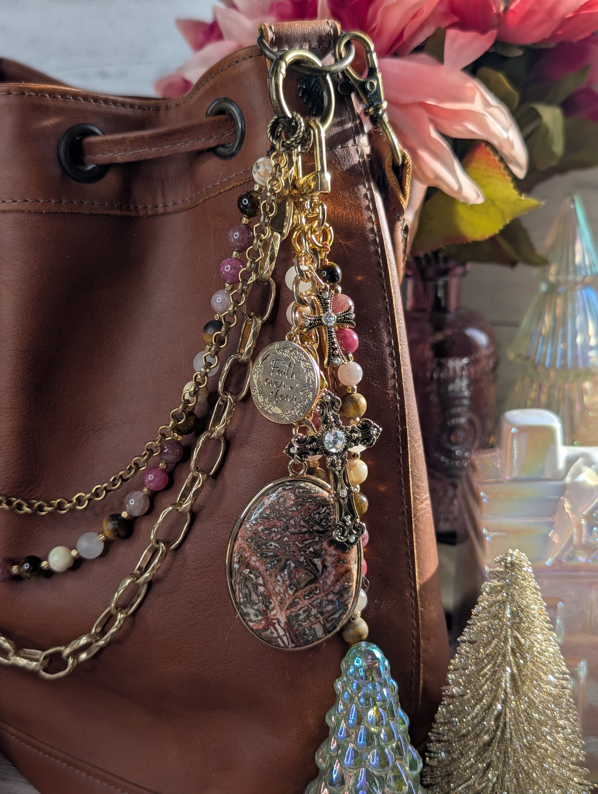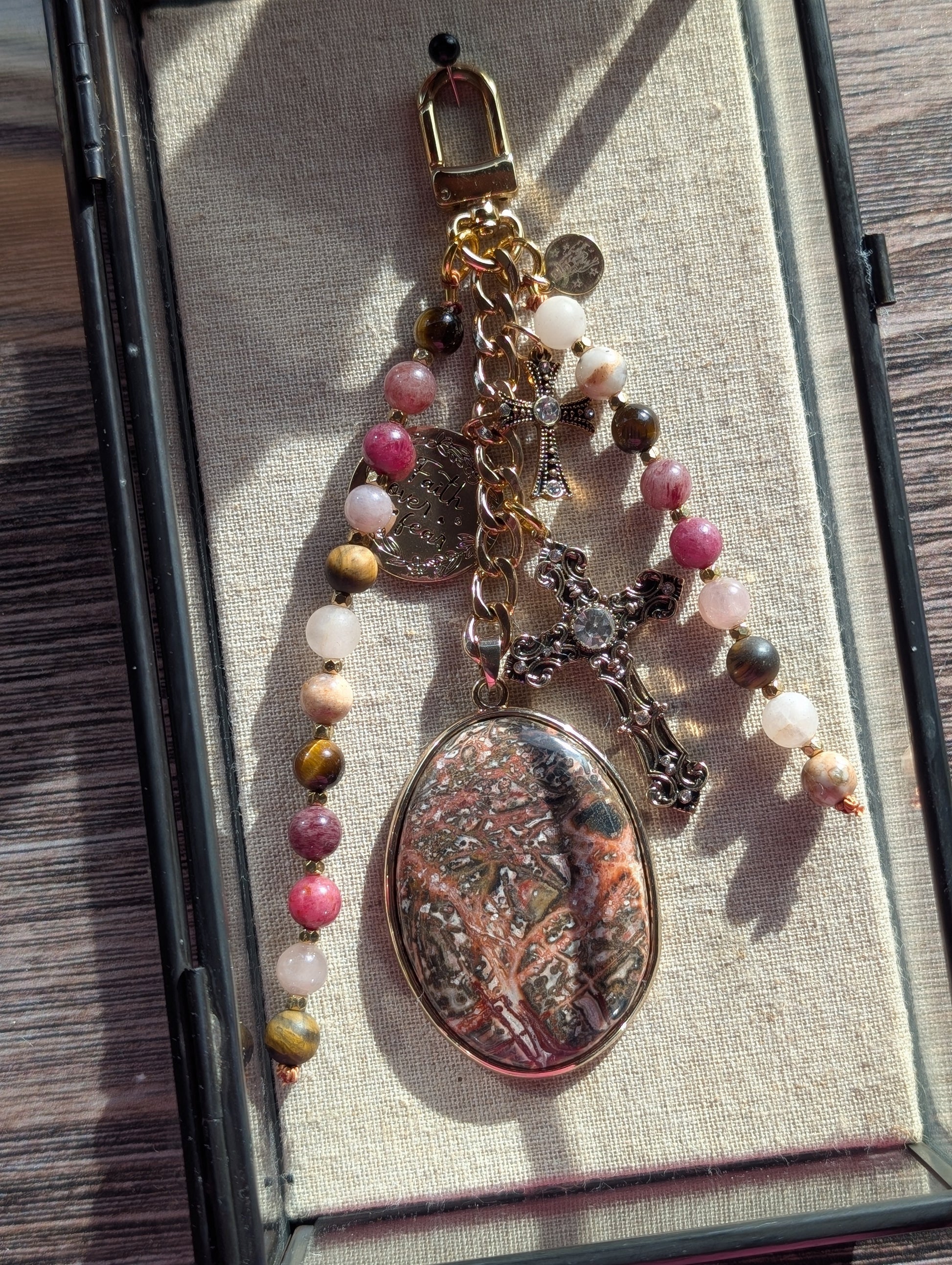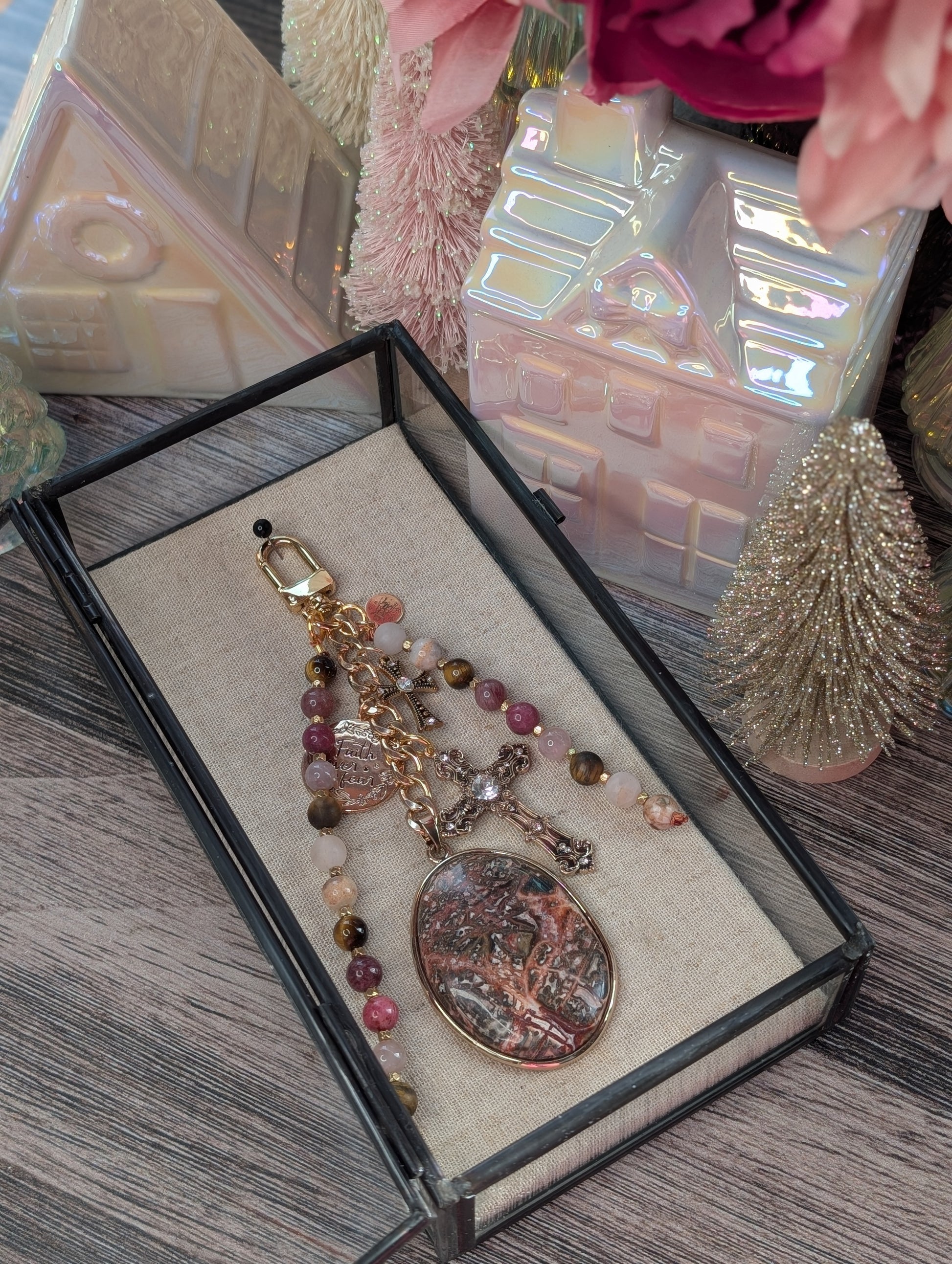 This piece features a beautiful Picture Jasper pendant and is 6.5" from top of clip to lowest point of keycharn.