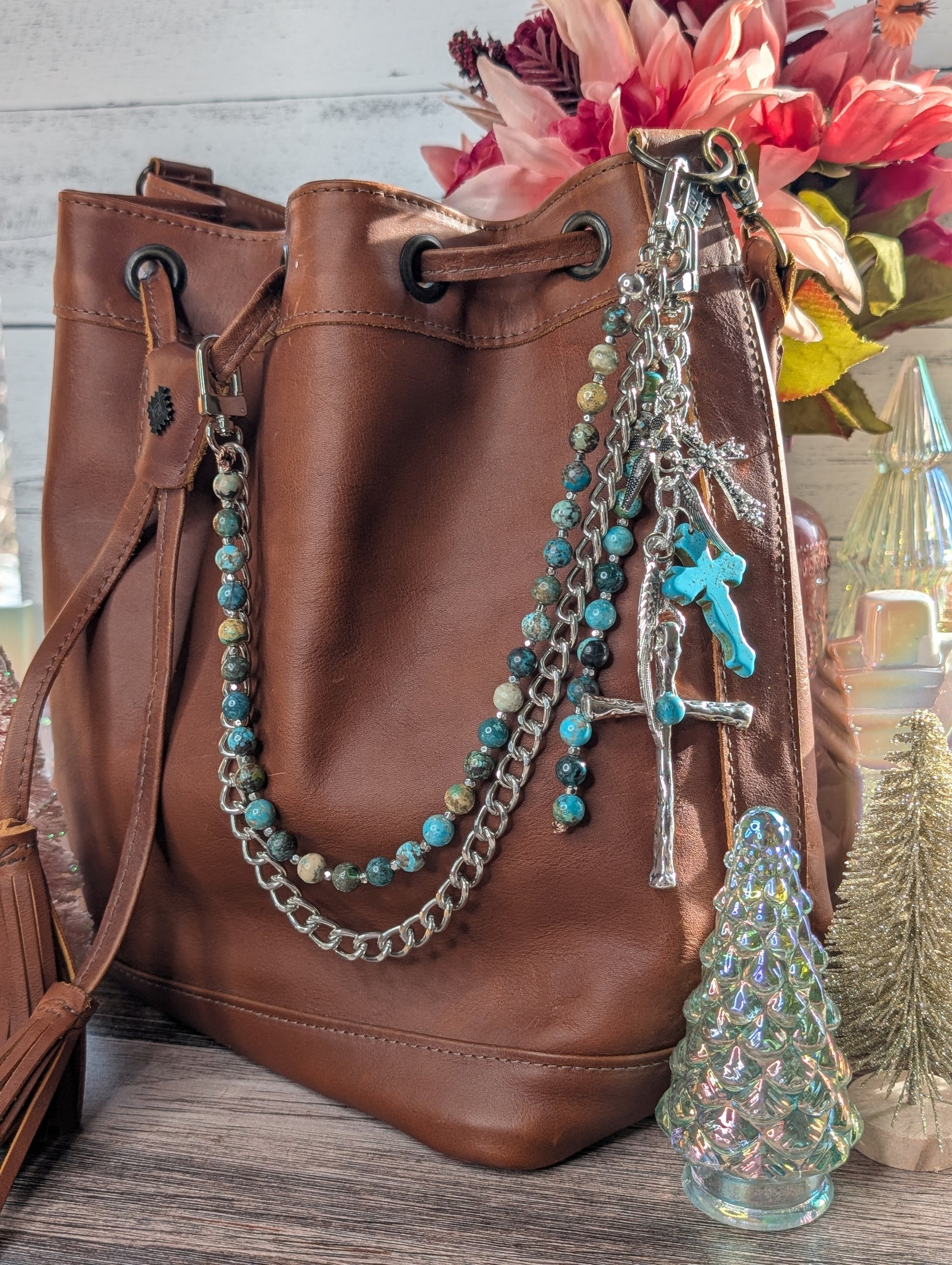 This piece features Genuine Turquoise and is 7" from top of clip to lowest point of keycharn.