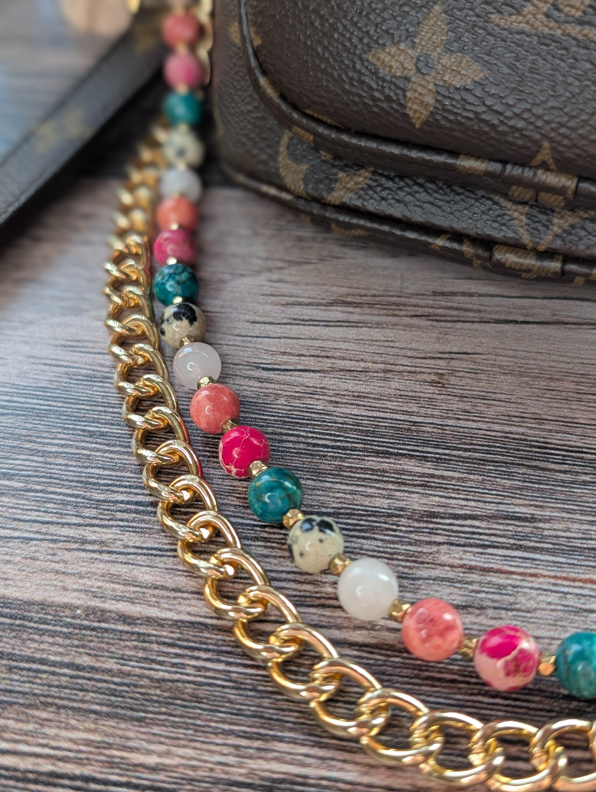This new Luxe BBC is created with beautiful Rose Quartz , Rhodochrosite, Sea Sediment Jasper, Magnesote Turquoise, Dalmatian Jasper featuring gold toned spacers and chain and luxe snaps.