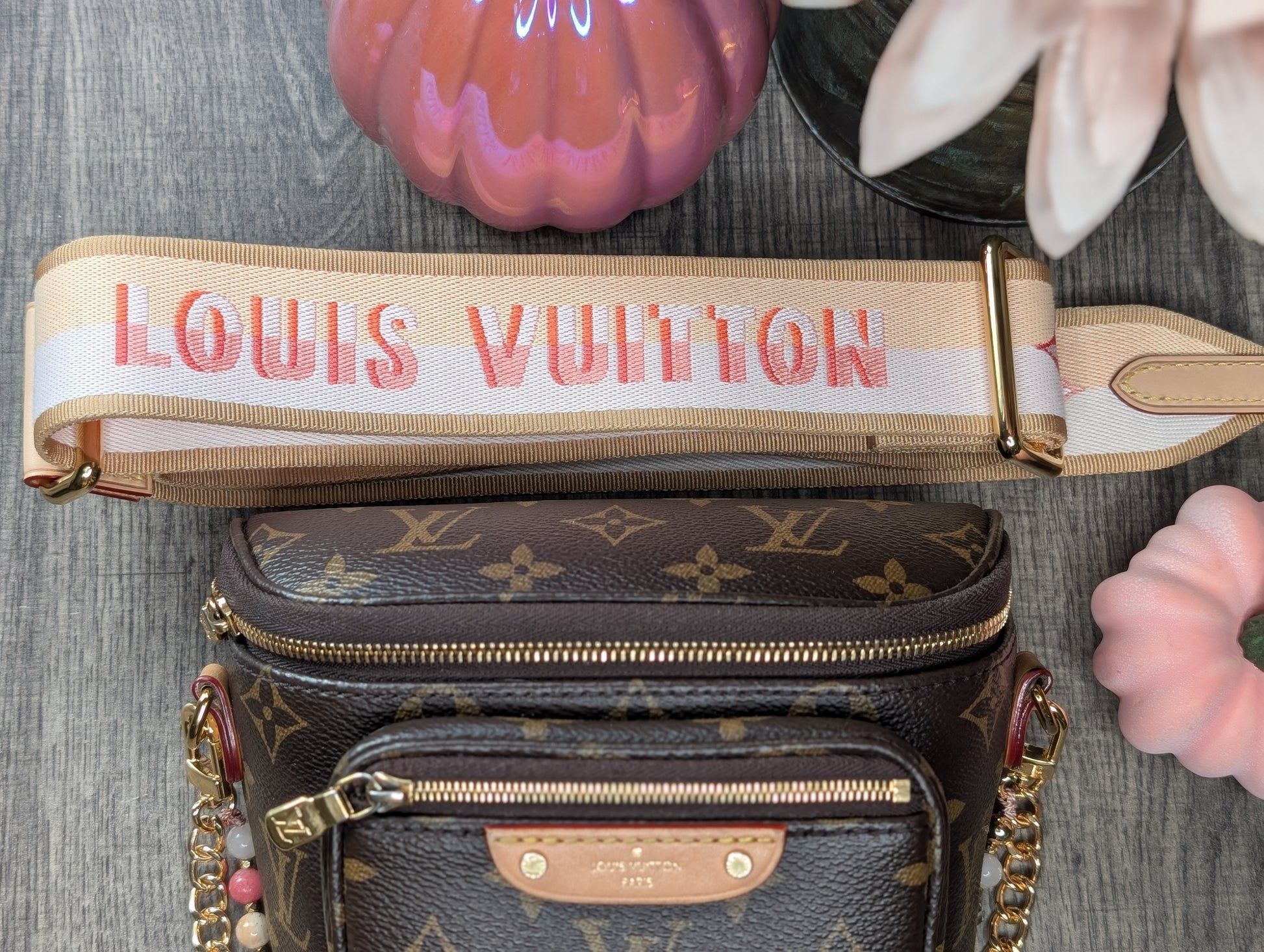 *This is an authentic LOUIS VUITTON Jacquard Speedy Bandouliere 20 Shoulder Strap in Pink and Orange. This strap is crafted of canvas with the Louis Vuitton Paris logo embroidered throughout. The ends feature gold-toned d-ring hooks mounted on vachetta straps. Length: 48" Width: 1.75"