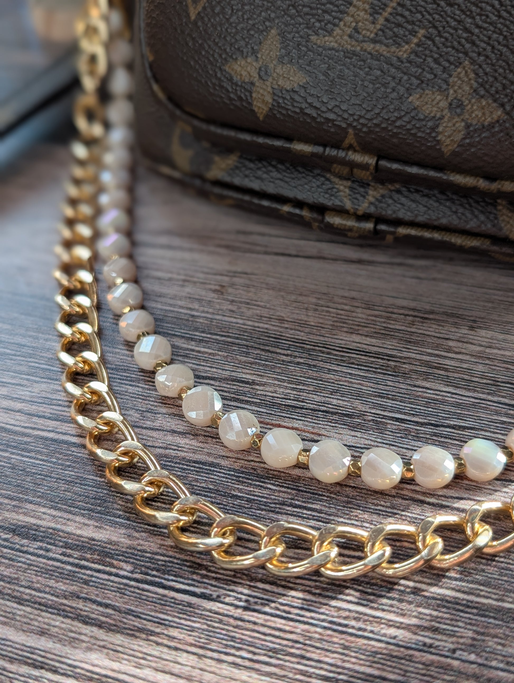 This Luxe BBC is created with 8mm milky pearl toned faceted glass beads, beaded on cornelian silk cord with gold toned spacers, gold plated chain and luxe gold tone snaps.