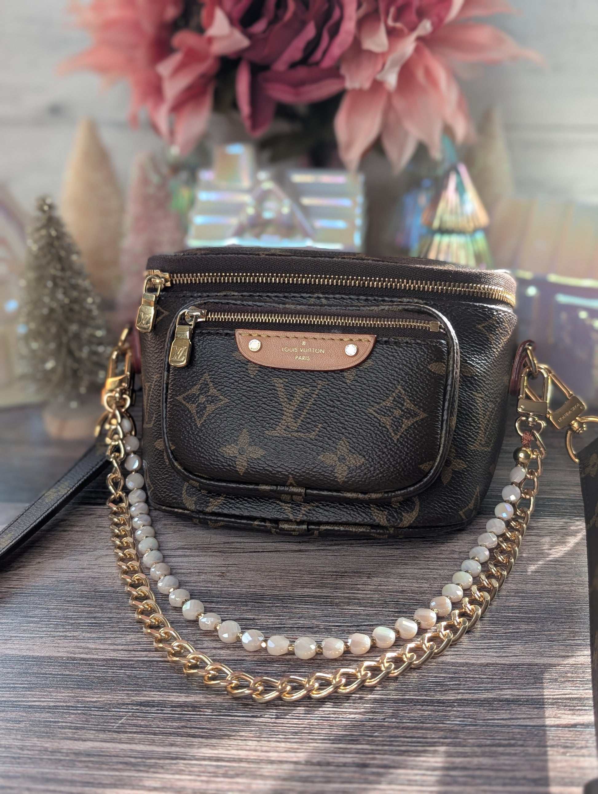 All of my one of a kind beaded bag chains are hand strung on 100% silk cord using luxe grade gold snaps at each end. Each piece measures approximately 16.5" long from clip end to clip end.