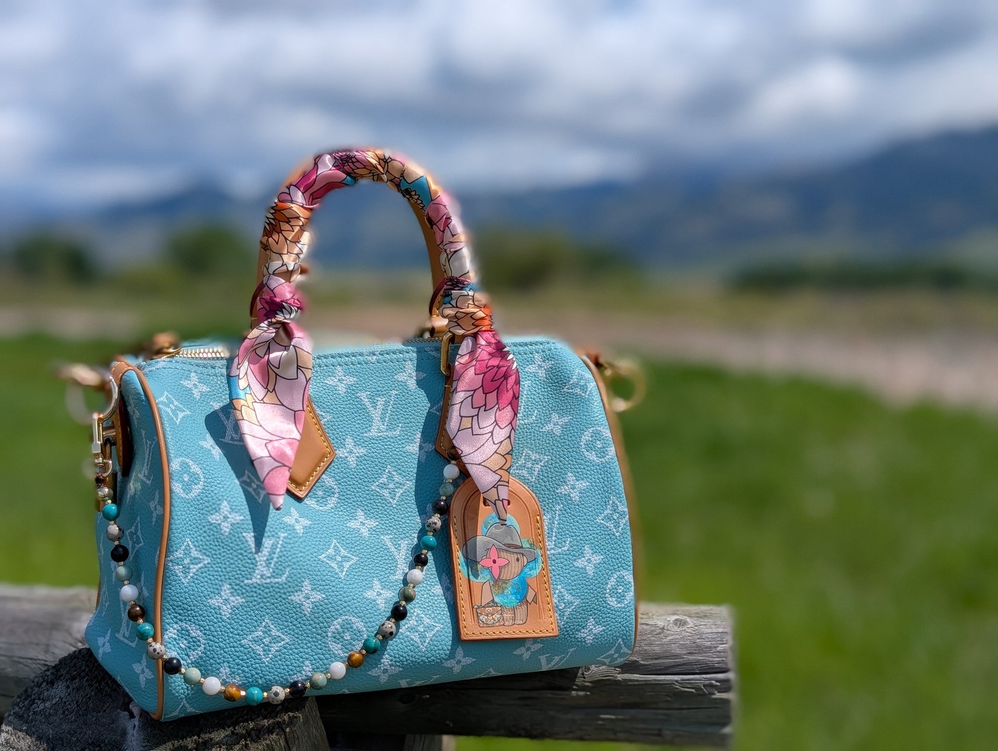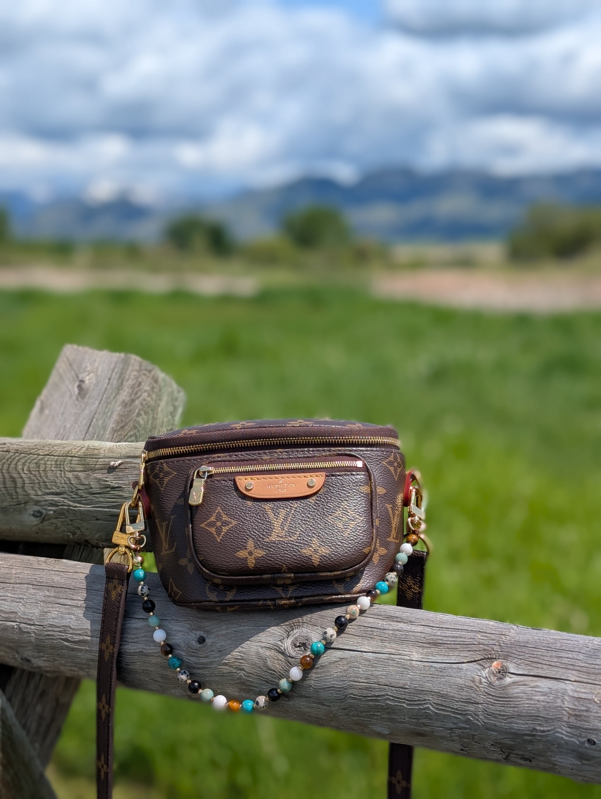 All of my one of a kind beaded bag chains are hand strung on 100% silk cord using luxe grade gold snaps at each end. Each piece measures approximately 15" long from clip end to clip end.