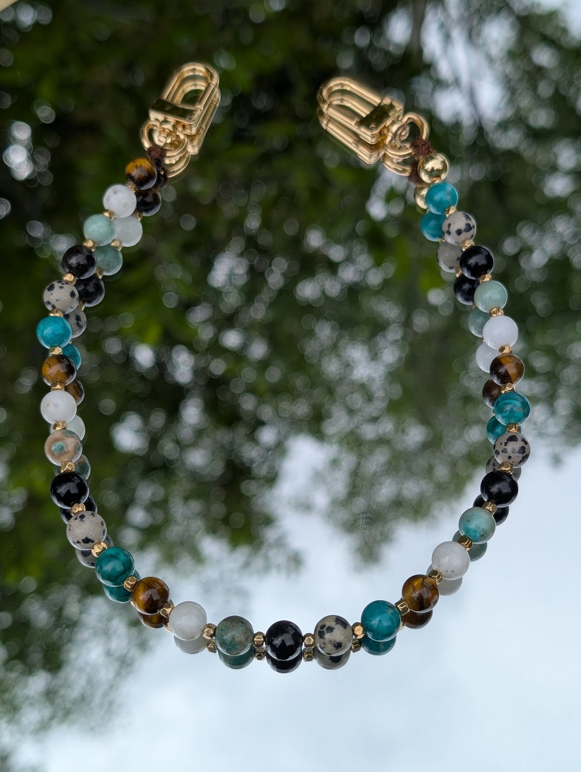 This new Luxe BBC is created with beautiful 8mm Black Tourmaline, Dalmatian Jasper, Genuine Turquoise, Tigers Eye, Rainbow Moonstone, Magnesite Turquoise featuring gold tone spacers and luxe snaps.